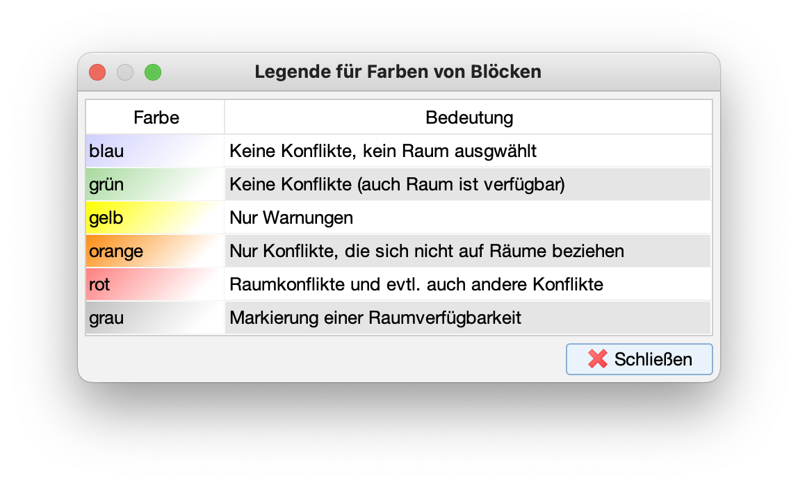 - Falls Sie es als nützlich empfinden, können Sie die Lehrveranstaltungen auch einfärben. Dann kann man den Stundenplan in der Kalenderansicht des Planer-Clients auch mit farbigen Lehrveranstaltung anzeigen. Das kann die Übersicht erhöhen.
