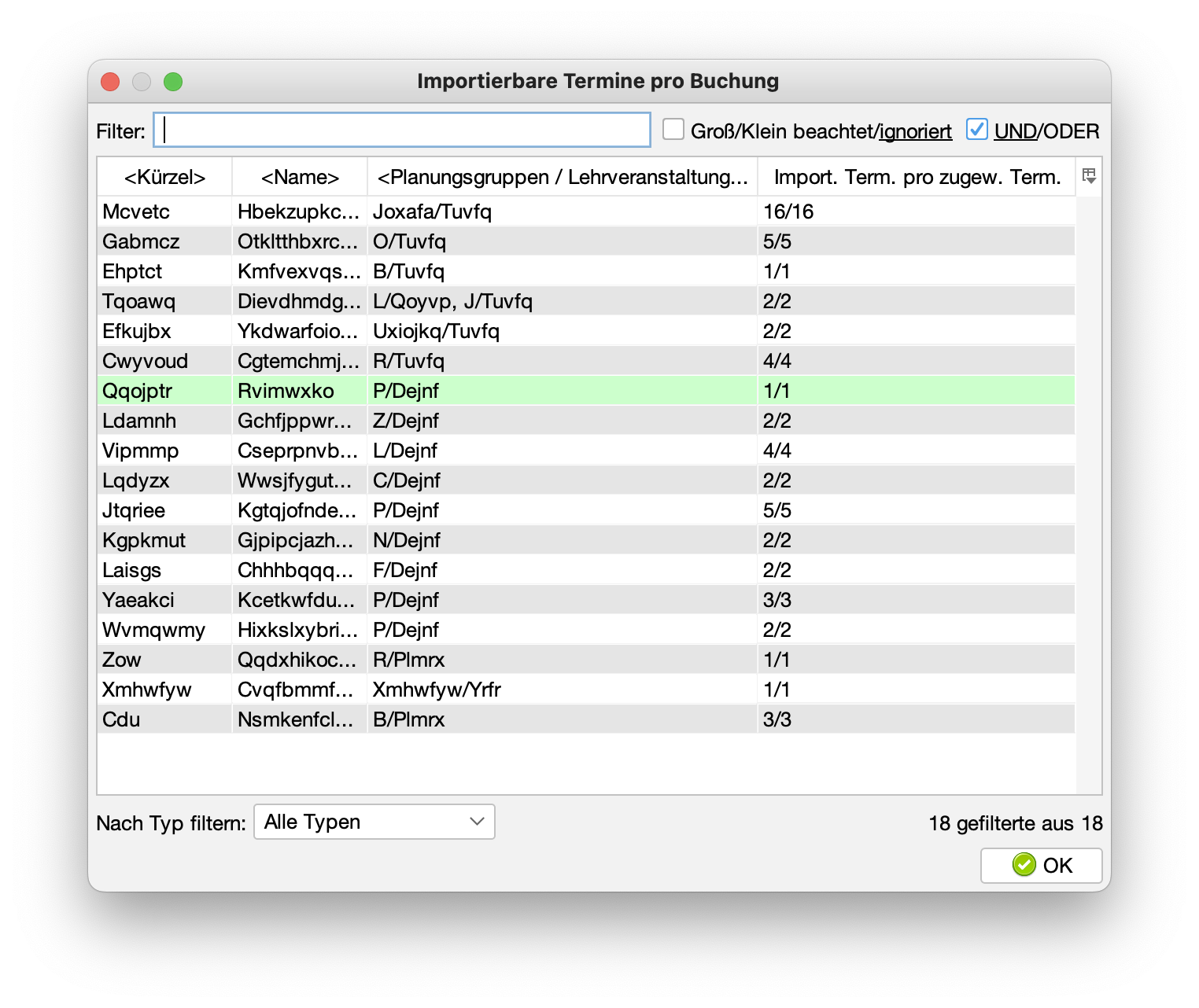 Tipp: Sortieren Sie die Tabelle durch Klicken auf die Spaltenüberschrift "Planungsgruppen/Lehrveranstaltungen", dann finden Sie die gewünschten Buchungen schneller.