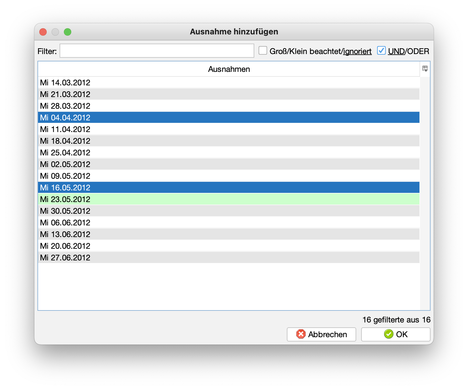 Wählen Sie den Tag aus, an dem die Veranstaltung ausfällt, und klicken Sie auf "OK". Der ausgewählte Termin erscheint dann unter "Ausnahmen".