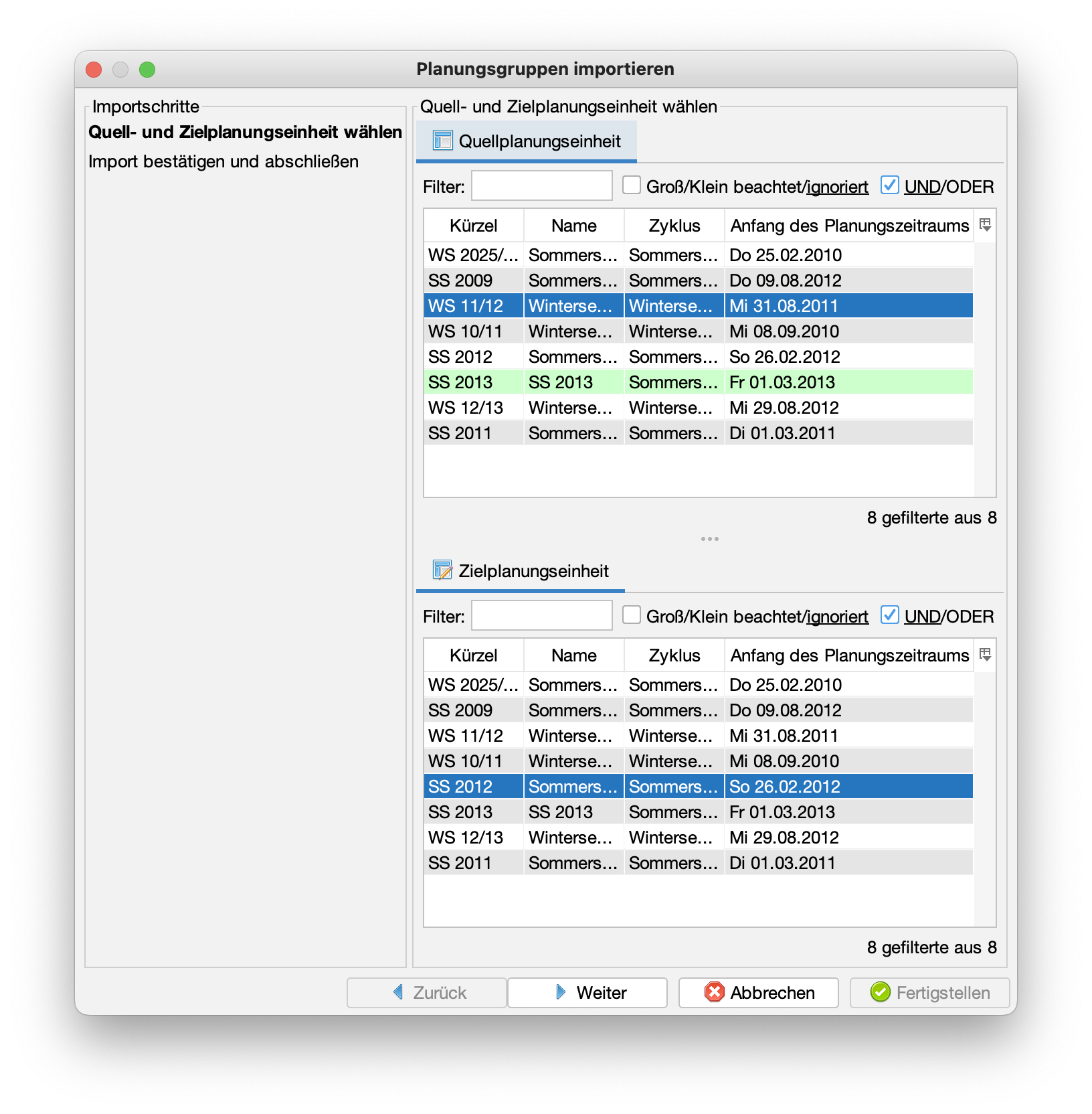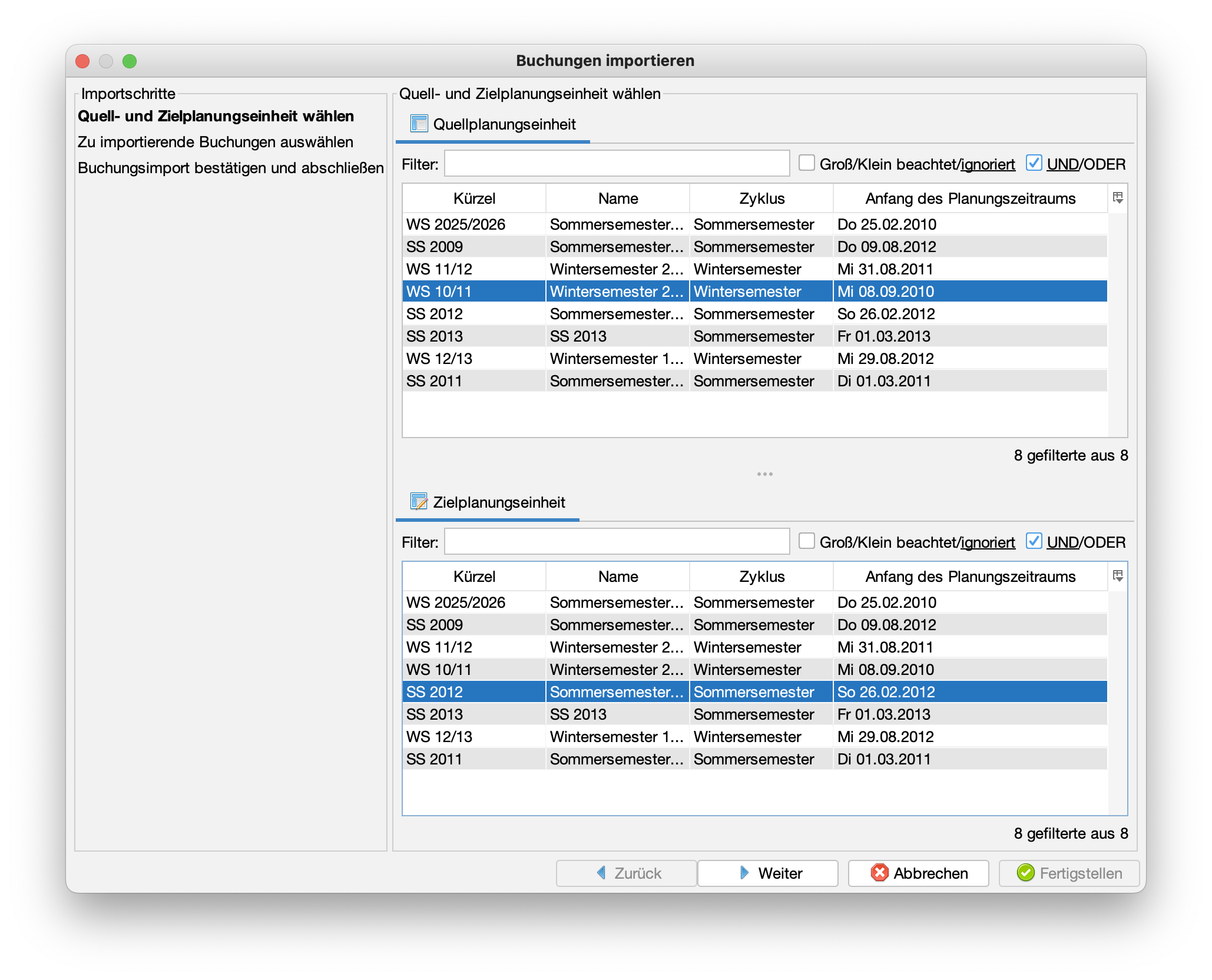 Im Beispiel sollen die Buchungen aus dem Wintersemester "WS 10/11" auf das Sommersemester "SS 2012" übertragen werden.
