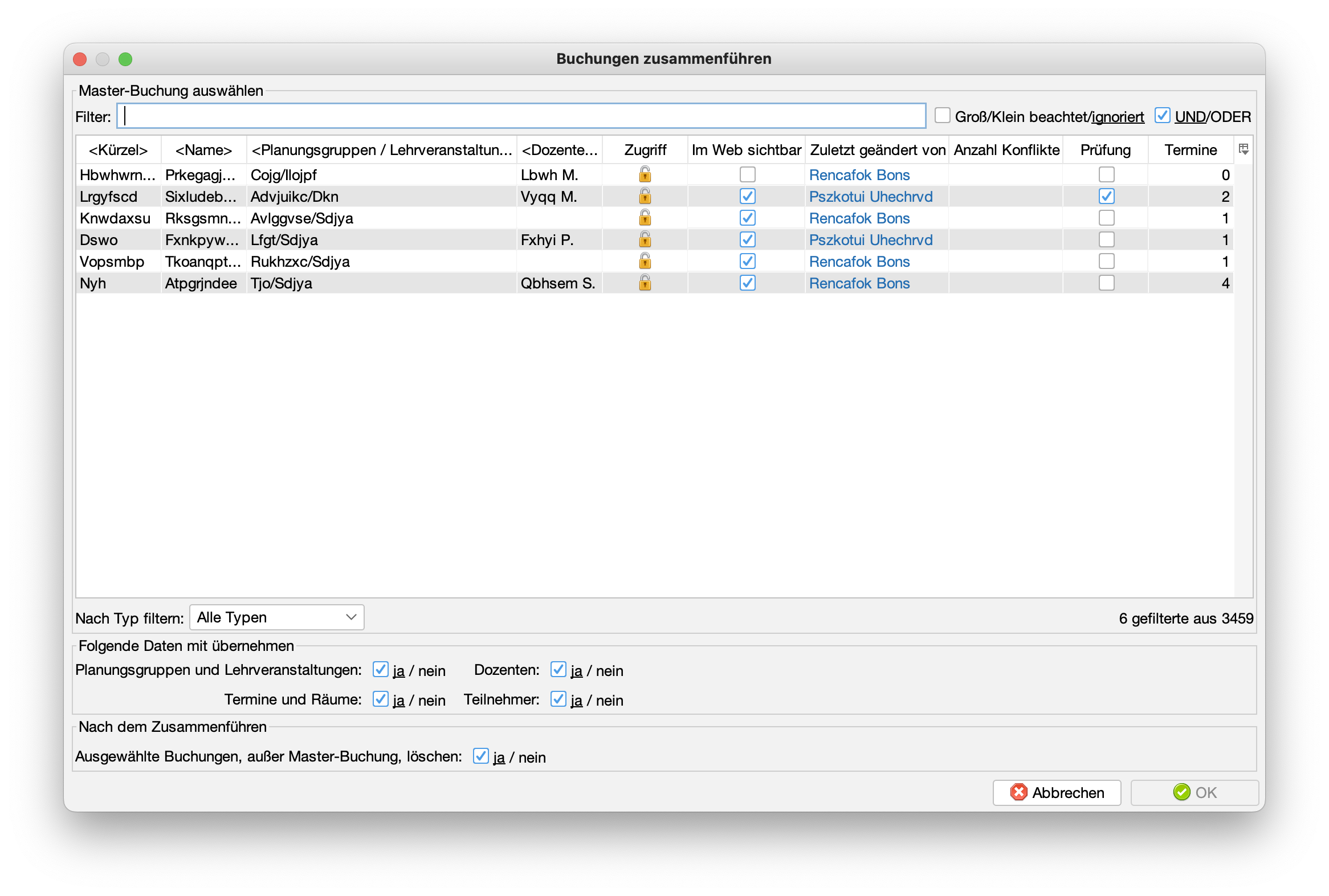 Das folgende Beispiel zeigt alle Buchungen, die "xyz" enthalten in der Spalte "Name", "Kürzel", "Planungsgruppe / Lehrveranstaltungen" oder "Dozenten":