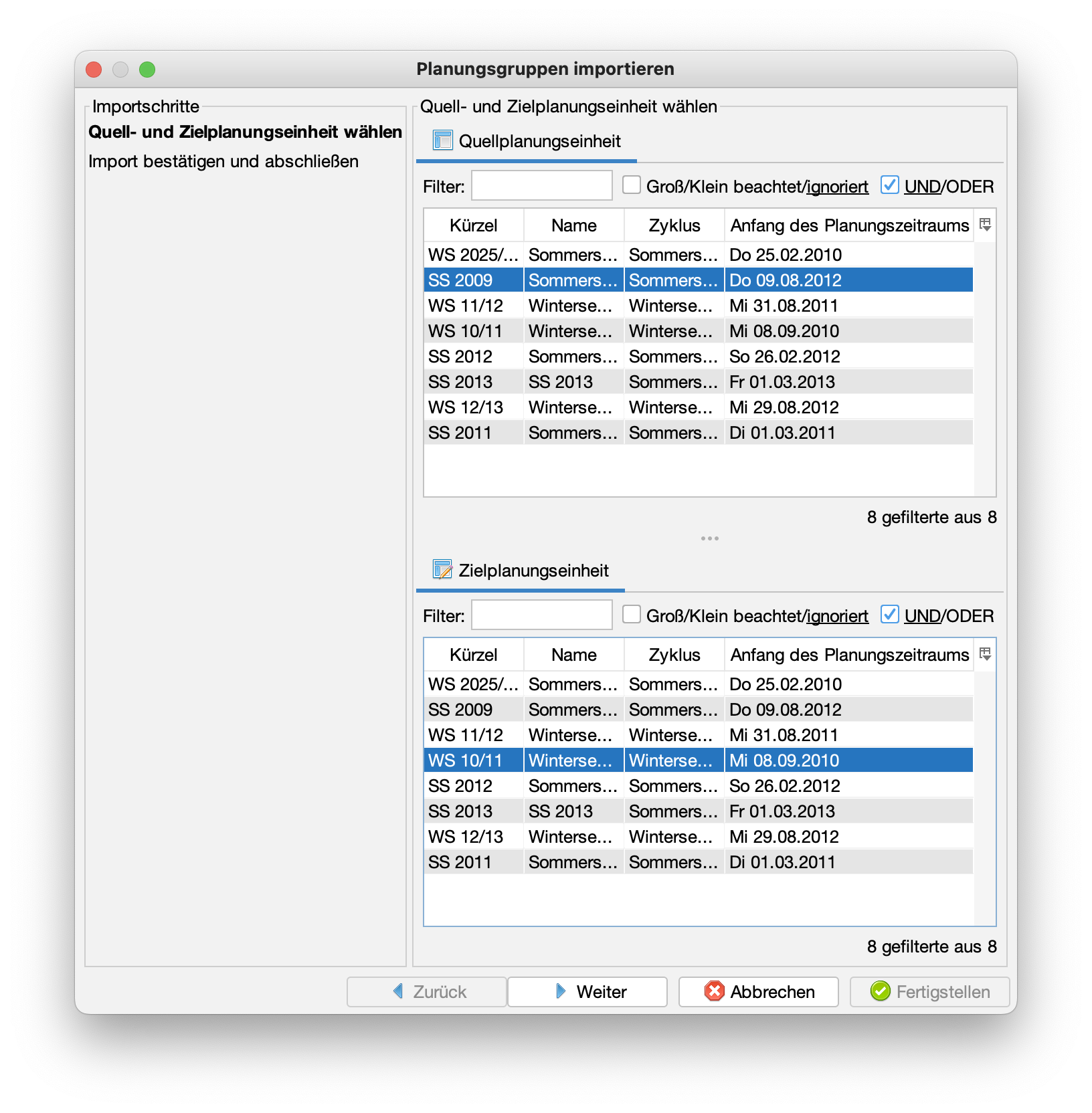 - Im nachfolgenden Auswahldialog wählen Sie oben die Planungseinheit, aus der Sie die Planungsgruppen übernehmen möchten und im unteren Teil die Planungseinheit, in die Sie die Planungsgruppen eintragen wollen. Im Beispiel sollen die Planungsgruppen und Verfügbarkeiten aus dem Sommersemester "SS 2009" auf das Wintersemester "WS 10/11" übertragen werden: